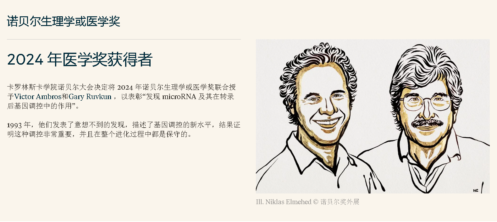 新華社快訊:瑞典卡羅琳醫學院7日宣布,美國科學家維克托·安布羅斯和加里·魯夫坎因發現微小核糖核酸及其在轉錄后基因調控中的作用而獲得2024年諾貝爾生理學或醫學獎。