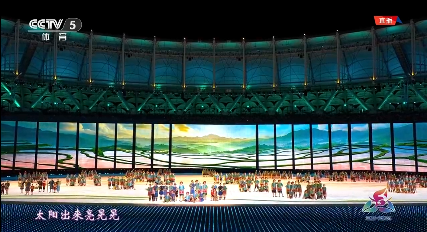 舞臺(tái)中間是一個(gè)圓形地屏,地屏外圈,導(dǎo)演組專門增加“星空矩形”地毯,圍繞中心地屏影像始終保持圓形圖案,構(gòu)成“同心圓”;在入場儀式、節(jié)目展演、點(diǎn)燃火炬等多個(gè)環(huán)節(jié),身穿各民族傳統(tǒng)服飾的參賽人員、表演者等,多次在舞臺(tái)匯聚成“同心圓”;“一顆心,一個(gè)圓,一齊擁抱緊相連……”“同心圓”概念也在主題曲中彰顯。
