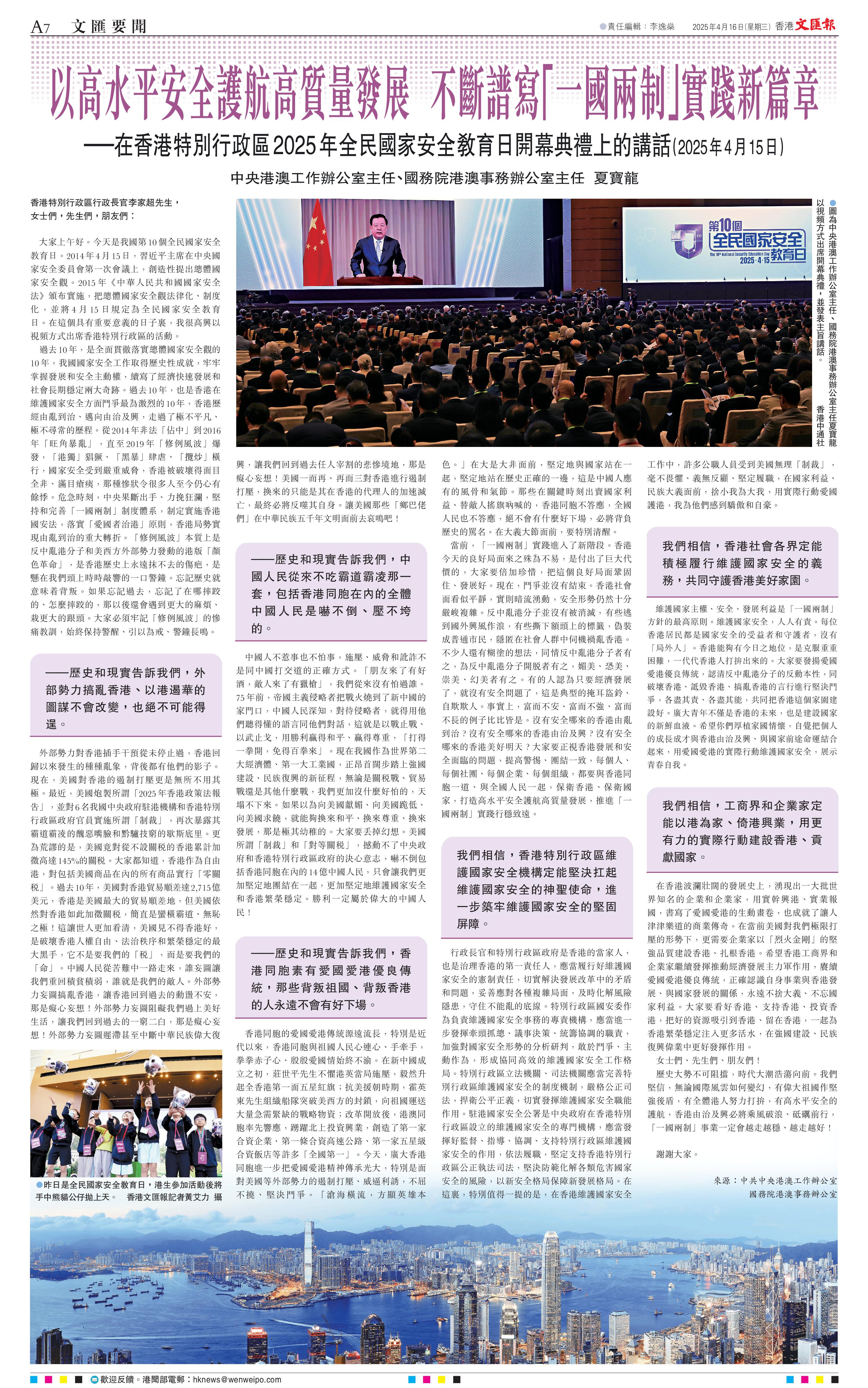 「我們相信,香港特別行政區維護國家安全機構定能堅決扛起維護國家安全的神圣使命,進一步筑牢維護國家安全的堅固屏障。」夏寶龍表示,行政長官和特別行政區政府是香港的當家人,也是治理香港的第一責任人,應當履行好維護國家安全的憲制責任,切實解決發展改革中的矛盾和問題,妥善應對各種復雜局面,及時化解風險隱患,守住不能亂的底線。他特別提到,在香港維護國家安全工作中,許多公職人員受到美國無理制裁,毫不畏懼、義無反顧、堅定履職,在國家利益、民族大義面前,舍小我為大我,用實際行動愛國護港,為他們感到驕傲和自豪。