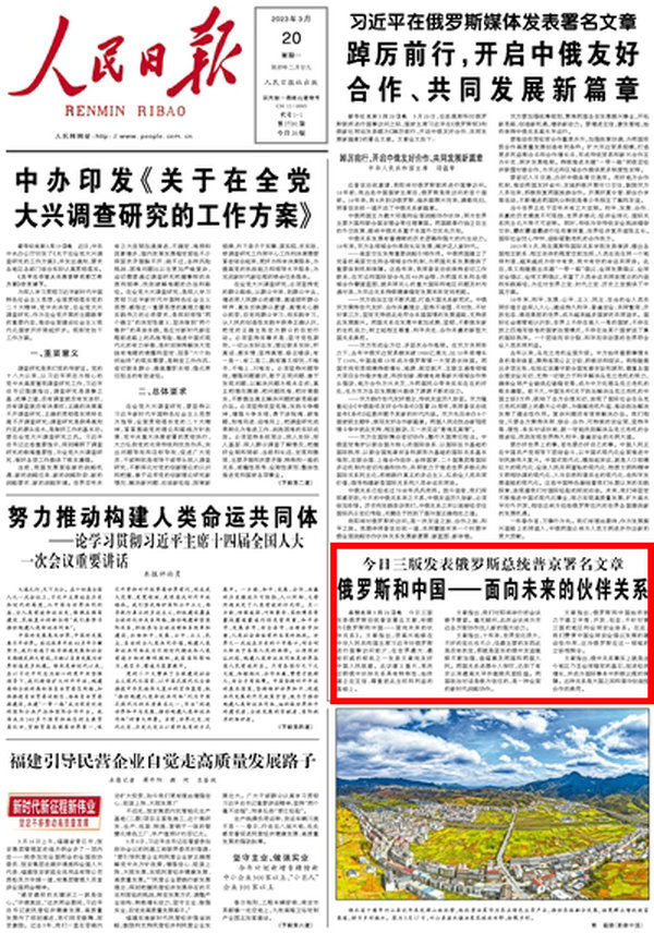 新華社北京3月20日電 在國家主席習近平對俄羅斯進行國事訪問前夕,俄羅斯總統普京20日在《人民日報》發表題為《俄羅斯和中國——面向未來的伙伴關系》的署名文章,向友好的中國人民致意,并表示俄中關系是大國之間和諧與創造性合作的典范,期待與習近平主席的會談為雙邊各方面協作注入新的強大動力。