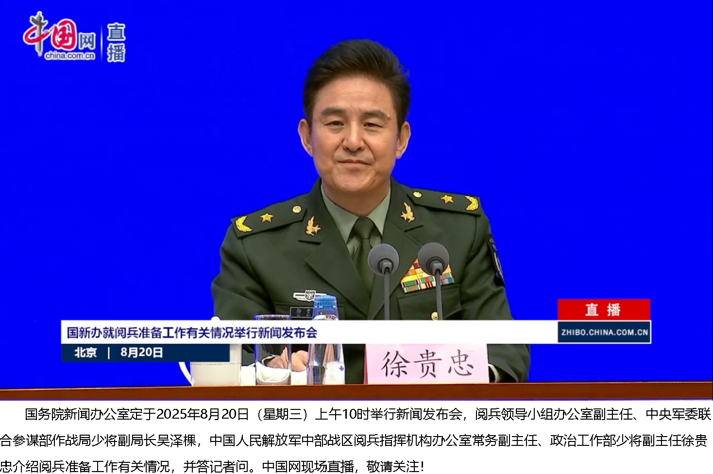 女士們、先生們,大家上午好。歡迎出席國務院新聞辦新聞發布會。今年是中國人民抗日戰爭暨世界反法西斯戰爭勝利80周年,9月3日將舉行盛大閱兵式。今天我們很高興邀請到閱兵領導小組辦公室副主任、中央軍委聯合參謀部作戰局少將副局長吳澤棵先生,中國人民解放軍中部戰區閱兵指揮機構辦公室常務副主任、政治工作部少將副主任徐貴忠先生,請他們為大家介紹閱兵準備工作有關情況,并回答大家關心的問題。