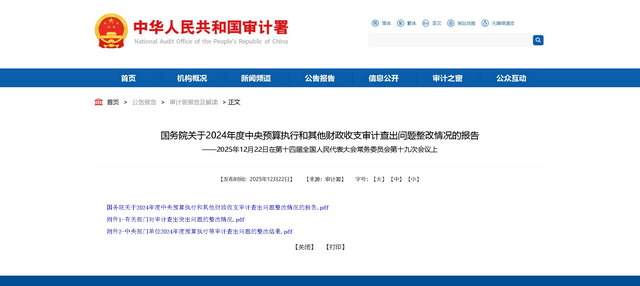 2025年12月22日,受國務院委托,審計署審計長侯凱向十四屆全國人大常委會第十九次會議作了《國務院關于2024年度中央預算執行和其他財政收支審計查出問題整改情況的報告》(以下簡稱《審計整改報告》)。為進一步了解2024年度審計整改有關情況,記者采訪了審計署政策研究室主要負責同志。
