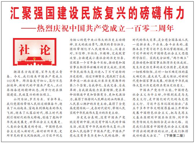 潮涌東方起宏圖,百年大黨正青春。今天,我們迎來中國共產黨成立102周年。踔厲奮發守初心,篤行不怠擔使命,新時代的中國共產黨人,正以昂揚奮進的精神狀態,闊步行進在強國建設、民族復興的新征程上。