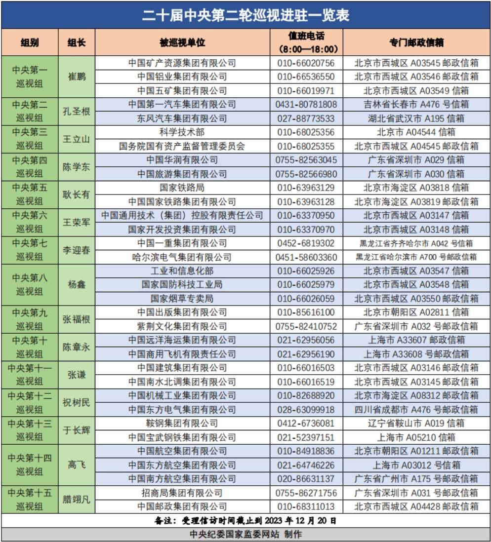 據(jù)悉,15個(gè)中央巡視組將在被巡視單位工作2個(gè)月左右,期間設(shè)立專門值班電話和郵政信箱,主要受理反映被巡視黨組織領(lǐng)導(dǎo)班子及其成員、下一級黨組織主要負(fù)責(zé)人和重點(diǎn)崗位人員問題的來信來電來訪,重點(diǎn)是關(guān)于違反政治紀(jì)律、組織紀(jì)律、廉潔紀(jì)律、群眾紀(jì)律、工作紀(jì)律和生活紀(jì)律以及巡視整改等方面問題反映。巡視組受理信訪時(shí)間截止到2023年12月20日。