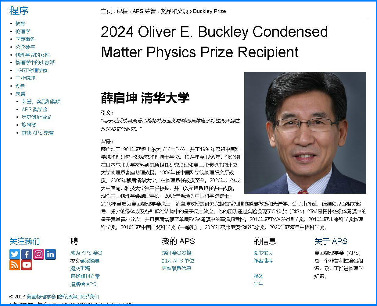 憑借拓撲絕緣體研究和在拓撲絕緣體中發現量子反常霍爾效應的創新突破,薛其坤成為巴克利獎授獎70年來首位中國籍獲獎者。