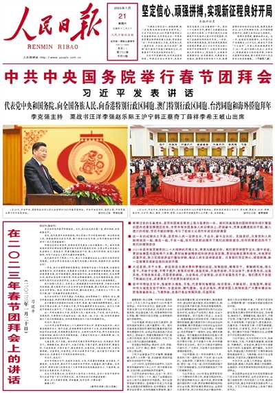 中共中央、國務院20日上午在人民大會堂舉行2023年春節團拜會。中共中央總書記、國家主席、中央軍委主席習近平發表講話,代表黨中央和國務院,向全國各族人民,向香港特別行政區同胞、澳門特別行政區同胞、臺灣同胞和海外僑胞拜年。春節前夕,習近平通過視頻連線看望慰問基層干部群眾,向全國各族人民致以新春的美好祝福,祝各族人民幸福安康,祝愿偉大祖國繁榮昌盛。