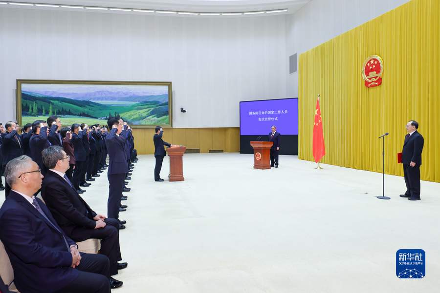 宣誓后,國務(wù)院總理李強作了講話。他強調(diào),誓詞雖短,但字字千鈞,希望大家把錚錚誓言銘記于心、踐之于行,忠于憲法、忠于祖國、忠于人民,不辜負黨和人民的重托。要堅持用習近平新時代中國特色社會主義思想凝心鑄魂,深刻領(lǐng)悟“兩個確立”的決定性意義,堅決做到“兩個維護”,不斷提高政治判斷力、政治領(lǐng)悟力、政治執(zhí)行力,當好貫徹黨中央決策部署的執(zhí)行者、行動派、實干家。要倍加珍惜黨和人民賦予的平臺,以奮發(fā)有為的精神狀態(tài)干事創(chuàng)業(yè),緊緊圍繞推進高質(zhì)量發(fā)展這個首要任務(wù),持續(xù)深化改革、擴大開放、推動創(chuàng)新、改善民生,勇于打破常規(guī),善于開辟新局,抓住主要矛盾綜合施策,聚焦瓶頸制約持續(xù)攻堅,以實干實績踐行誓言。要牢固樹立正確的權(quán)力觀、政績觀、事業(yè)觀,嚴格按照法定權(quán)限和程序履行職責、行使權(quán)力、承擔責任,始終繃緊廉潔自律這根弦,時時處處嚴格要求自己,堅決反對形式主義、官僚主義,大力弘揚勤儉節(jié)約、艱苦奮斗的優(yōu)良作風,為全面建設(shè)社會主義現(xiàn)代化國家、實現(xiàn)中華民族偉大復(fù)興中國夢不懈奮斗。