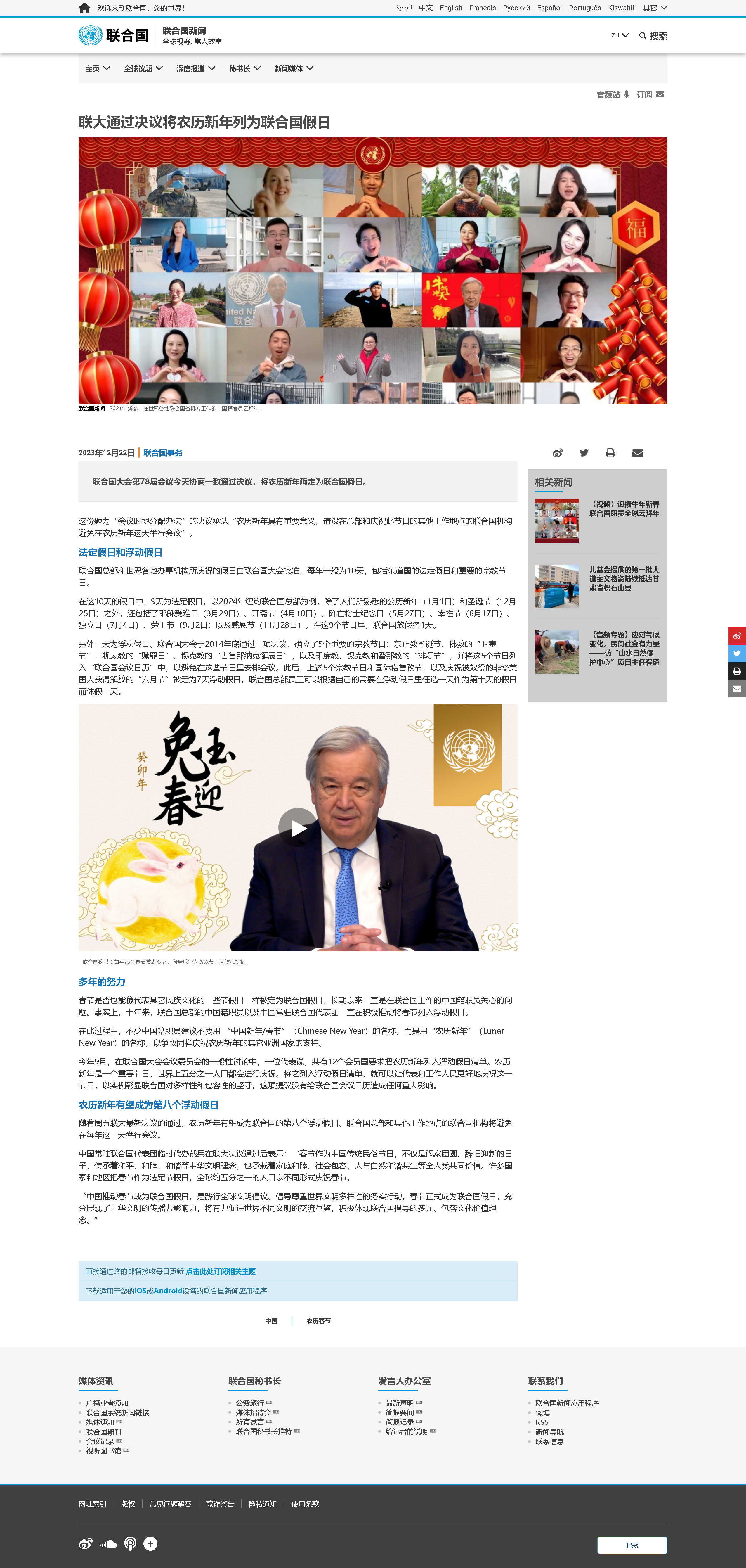 聯合國除了東道國的重要法定假日外,可由聯大通過決議,把世界范圍內廣泛慶祝的節日確定為聯合國假日,在當天盡量避免安排會議活動。聯合國秘書長每年都發表春節賀辭,向中國及所有慶祝春節(農歷新年)的各國人民致以節日問候和祝福。