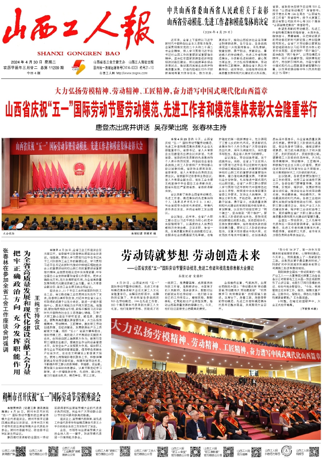 4月29日,山西省慶?!拔逡弧眹H勞動節暨勞動模范、先進工作者和模范集體表彰大會在太原隆重舉行。省委書記、省人大常委會主任唐登杰出席會議并講話,代表省委、省政府向受表彰的先進集體和個人表示熱烈祝賀,向奮戰在全省各條戰線上的工人階級和廣大勞動群眾致以誠摯問候。省政協主席吳存榮,省委常委,省人大常委會負責同志出席會議。省委副書記張春林主持會議,省人大常委會副主任、省總工會主席王純宣讀中華全國總工會表彰決定,副省長趙紅嚴宣讀省委、省政府表彰決定。