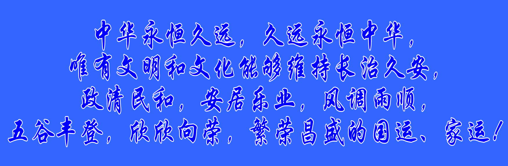 中華永恒久遠,久遠永恒中華,唯有文明和文化能夠維持長治久安,政清民和,安居樂業,風調雨順,五谷豐登,欣欣向榮,繁榮昌盛的國運、家運!