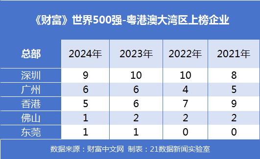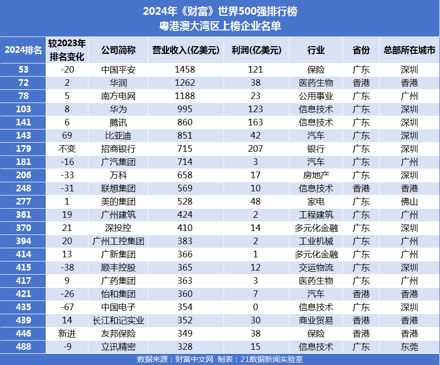 據21數據新聞實驗室統計,粵港澳大灣區共有22家公司入圍世界500強,2023年營收總額約為1.39萬億美元,利潤總額為919億美元。
