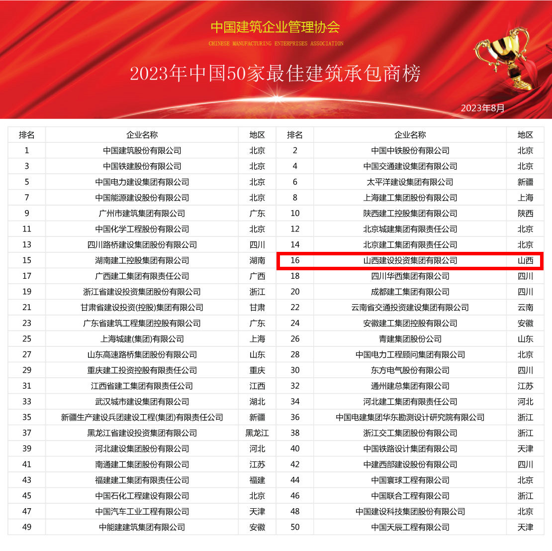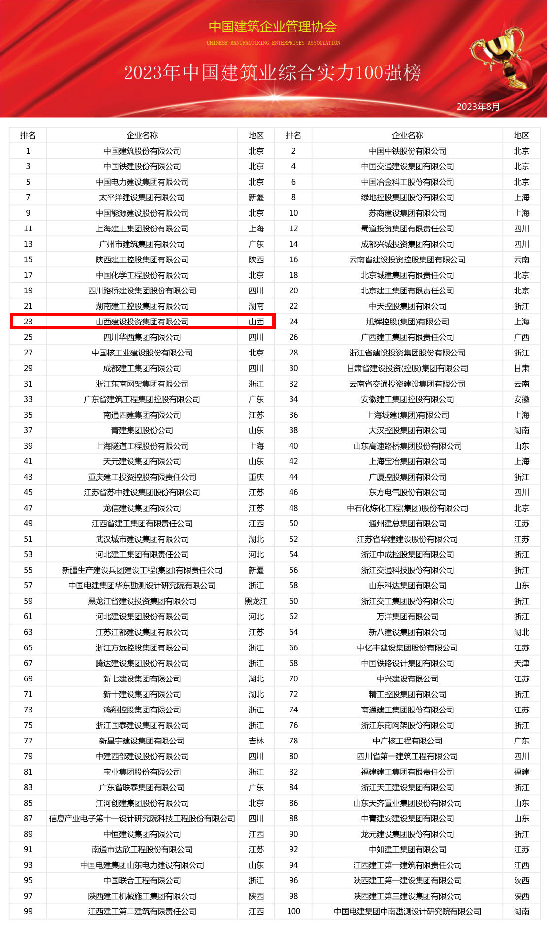展望未來,相信在這100強企業的引領下,中國建筑業將繼續秉持創新、協調、綠色、開放、共享的發展理念,不斷提升自身綜合實力。以匠心鑄就精品工程,為國家建設和人民的幸福生活添磚加瓦,在實現中華民族偉大復興的壯麗征程中書寫更加輝煌燦爛的篇章。