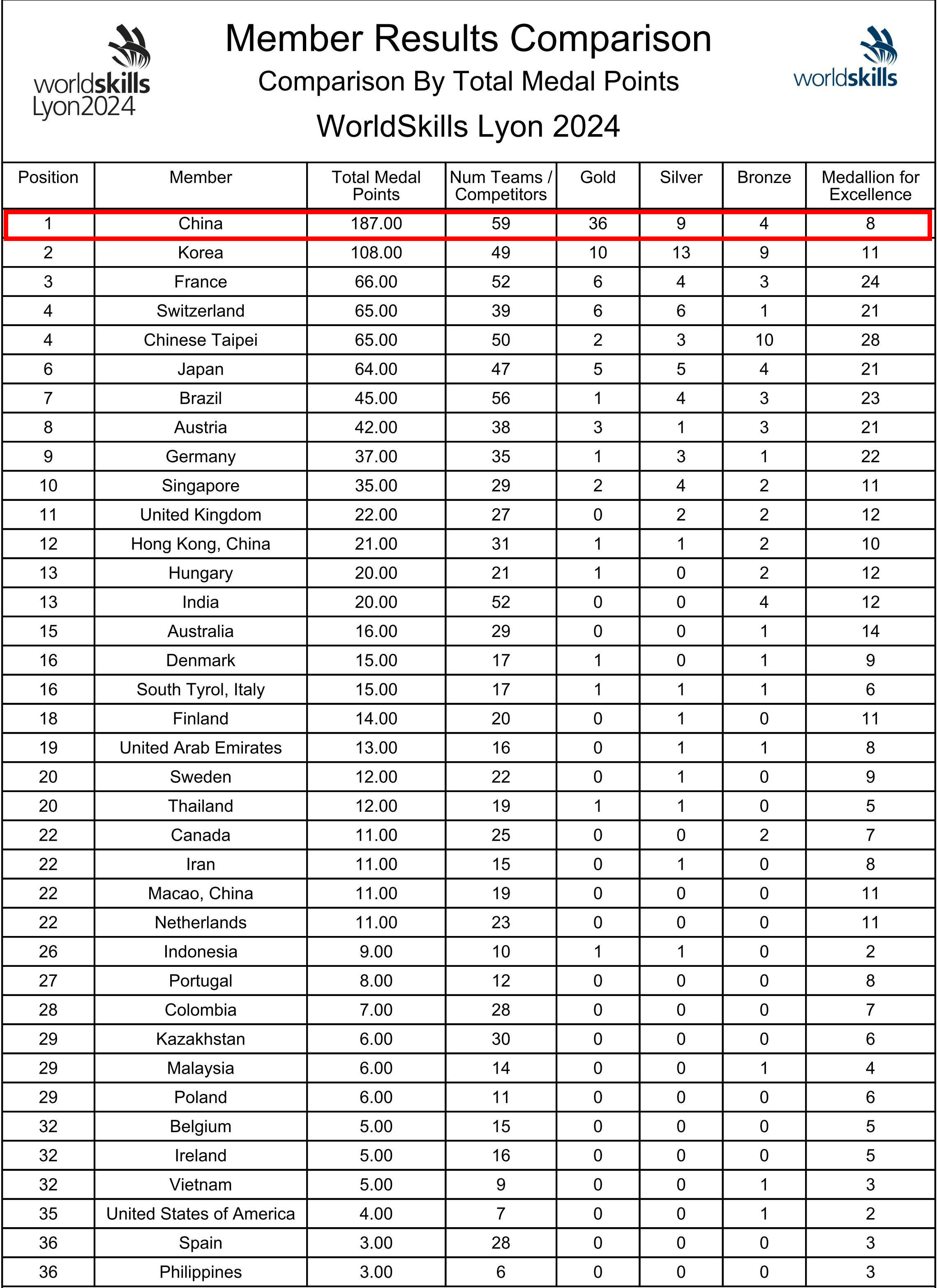 新華社法國里昂9月15日電 第47屆世界技能大賽15日晚在法國里昂閉幕,中國代表團在本次大賽中表現出色,在全部59個項目中,共獲得36枚金牌、9枚銀牌、4枚銅牌和8個優勝獎,位居金牌榜、獎牌榜和團體總分首位。