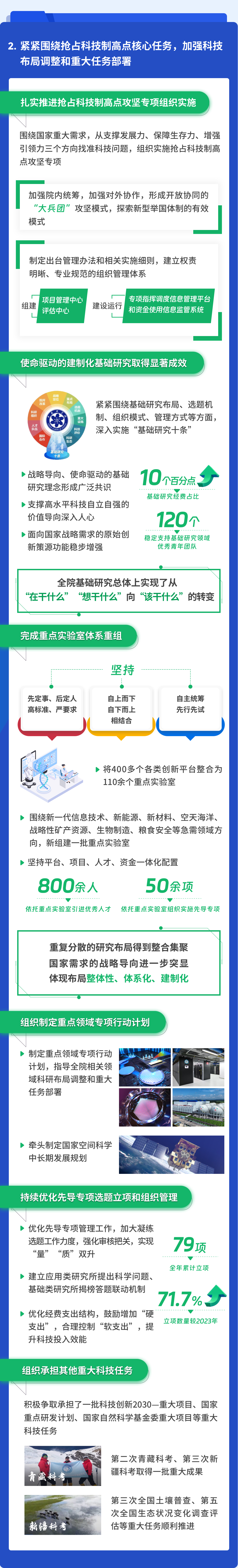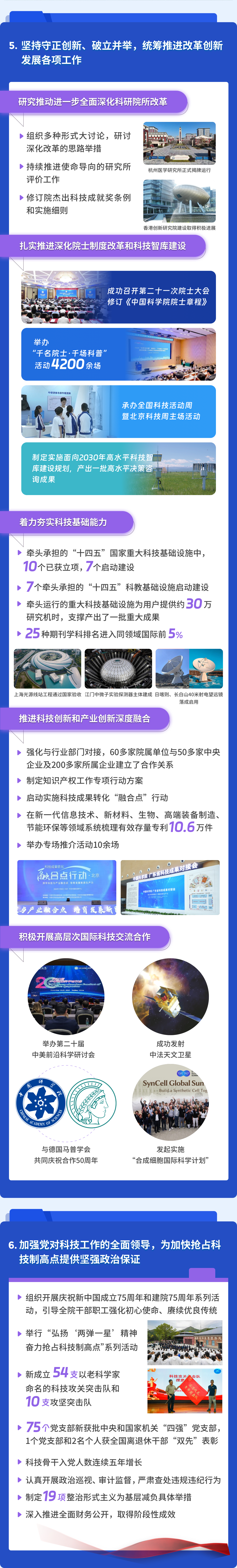 會議指出,2024年是新中國成立75周年,也是中國科學(xué)院建院75周年。一年來,全院上下認(rèn)真學(xué)習(xí)貫徹習(xí)近平總書記重要講話和重要指示批示精神,堅(jiān)決貫徹落實(shí)黨中央、國務(wù)院重大決策部署,緊緊圍繞習(xí)近平總書記對中國科學(xué)院提出的“四個率先”和“兩加快一努力”目標(biāo)要求,恪守國家戰(zhàn)略科技力量使命定位,加強(qiáng)黨對科技工作的全面領(lǐng)導(dǎo),扎實(shí)開展黨紀(jì)學(xué)習(xí)教育,深入推進(jìn)重大科技任務(wù)組織實(shí)施,關(guān)鍵核心技術(shù)攻關(guān)取得重要進(jìn)展,使命驅(qū)動的建制化基礎(chǔ)研究取得顯著成效,完成重點(diǎn)實(shí)驗(yàn)室體系重組,圍繞“四個面向”取得一批重大創(chuàng)新成果,搶占科技制高點(diǎn)攻堅(jiān)實(shí)現(xiàn)良好開局,改革創(chuàng)新發(fā)展各項(xiàng)工作邁上新臺階。