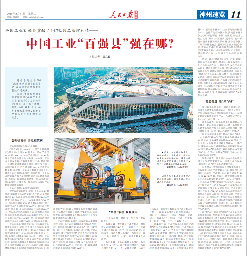 首先強在創新研發。去年,工業百強縣(縣級市)高新技術企業數量超3.3萬家,占全國總量的8.4%;全社會研究與試驗發展(R&D)經費支出約3160億元,比2023年增長約360億元,占全國比重超10%;15個縣(縣級市)規上高新技術產業增加值超200億元,其中浙江慈溪市、岱山縣、余姚市和湖南長沙縣超400億元。作為縣域經濟的典型代表,江蘇昆山連續20年位居全國綜合實力百強縣市首位,工業正是其引領產業。2024年,昆山所擁有的國家高新技術企業達到2744家,位居百強縣之首。