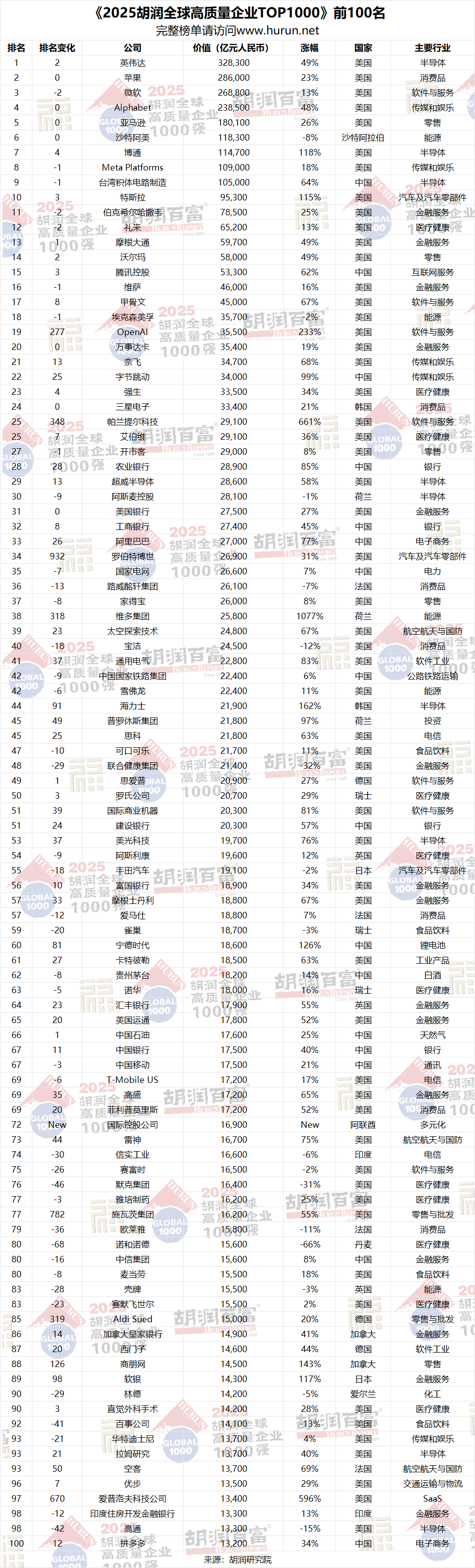 自2024年起,胡潤研究院將全球最具價值公司榜單從500強擴展至1000強,并將國有企業納入其中。