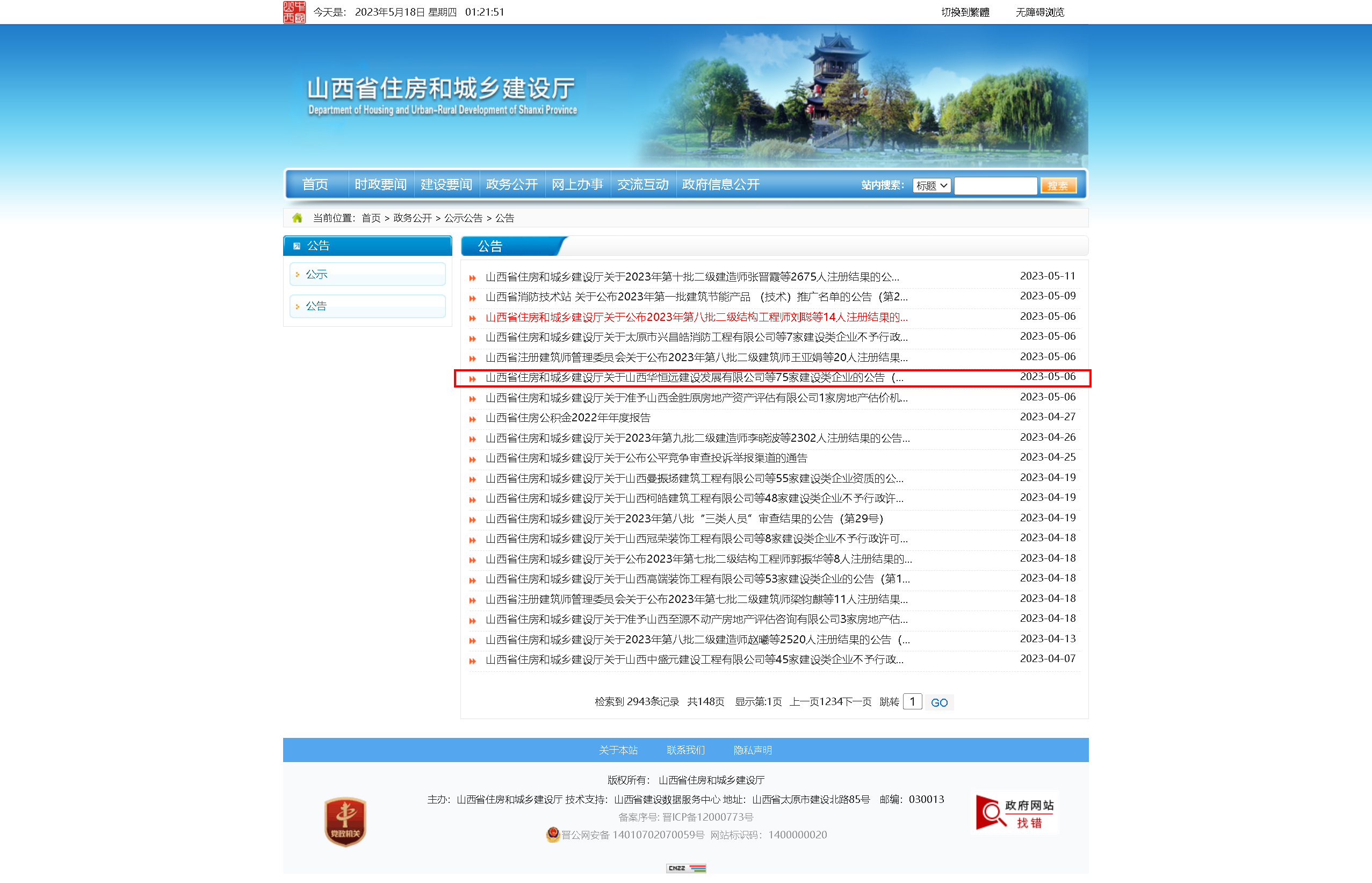 根據《中華人民共和國建筑法》、《建筑施工企業安全生產許可證管理規定》(建設部128號令)、《山西省<建筑施工企業安全生產許可證管理規定>實施意見》(晉建建字[2004]288號)、《關于做好建筑施工企業安全生產許可證延期工作的通知》(晉建建字[2007]447號)、《建設工程質量檢測管理辦法》(建設部令第141號)等有關規定,現將我廳依法審查核準的山西華恒遠建設發展有限公司等75家建設類企業審查結果予以公布。