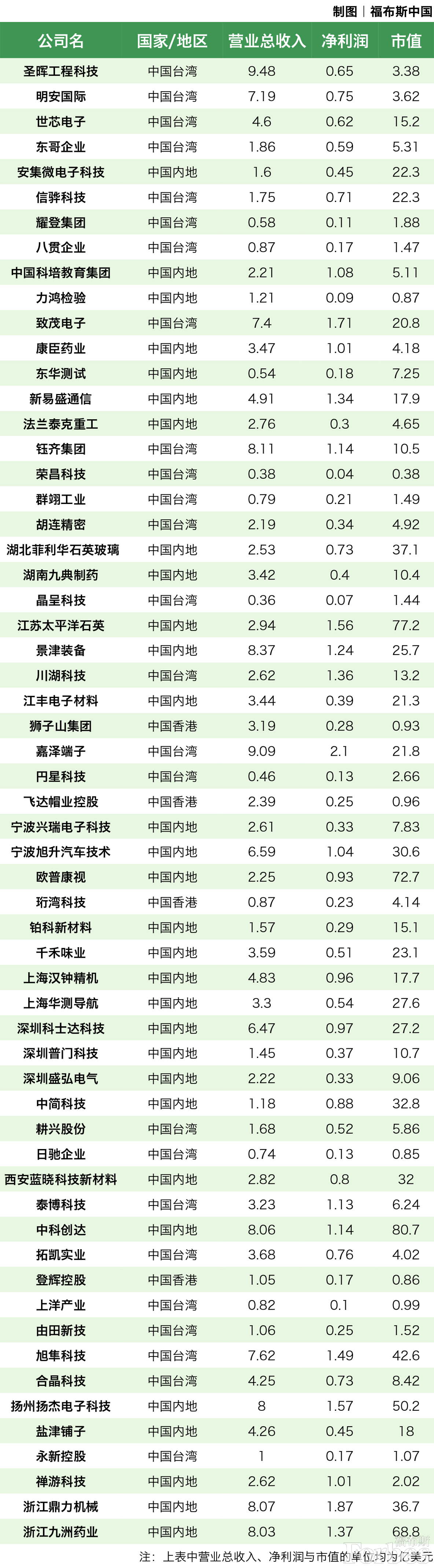 在這份榜單上,其他表現優異的公司還包括提供IT解決方案的公司,這些解決方案為醫療保健、物流和制造業以及其他行業的數字化轉型奠定了基礎。與此同時,隨著新冠肺炎限制措施的解除,餐館、娛樂和體育等依賴消費支出企業的營收也繼續上升。本次共有59家中國企業上榜,其中內地30家,香港4家,臺灣25家。今年的榜單也包括去年的58家上榜企業。