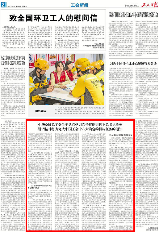 2023年10月9日至12日召開的中國工會第十八次全國代表大會,是在我國邁上全面建設社會主義現代化國家新征程、向第二個百年奮斗目標進軍的關鍵時刻召開的一次十分重要的大會,是全國廣大工會工作者和億萬職工群眾政治生活中的一件大事。以習近平同志為核心的黨中央高度重視中國工會十八大,習近平總書記等黨和國家領導人出席大會開幕式,中共中央政治局常委、中央書記處書記蔡奇代表黨中央向大會作了題為《奮力書寫我國工人階級投身強國建設民族復興的壯麗篇章》的致詞;大會閉幕后,10月23日,習近平總書記同中華全國總工會新一屆領導班子成員集體談話并發表重要講話,高度評價黨的十八大以來我國工人階級在黨和國家事業發展中作出的重大貢獻,充分肯定新時代工運事業取得歷史性成就、工會工作實現全方位進步,對做好今后一個時期的工會工作提出明確要求。這些充分體現了黨中央對工人階級和工會工作的高度重視,是對全國廣大工會工作者和億萬職工群眾的親切關懷和巨大鼓舞。認真學習宣傳貫徹習近平總書記重要講話精神、努力完成中國工會十八大確定的目標任務,是當前和今后一個時期各級工會的重大政治任務。現就做好學習宣傳貫徹工作通知如下。