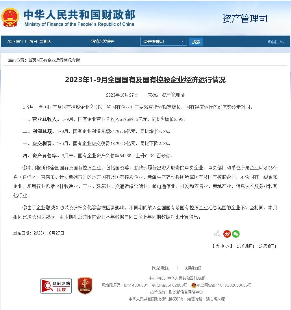 中新網(wǎng)10月27日電 財(cái)政部網(wǎng)站27日發(fā)布2023年1-9月全國國有及國有控股企業(yè)經(jīng)濟(jì)運(yùn)行情況,1-9月,全國國有及國有控股企業(yè)(以下稱國有企業(yè))主要效益指標(biāo)穩(wěn)定增長,國有經(jīng)濟(jì)運(yùn)行向好態(tài)勢(shì)逐步鞏固。
