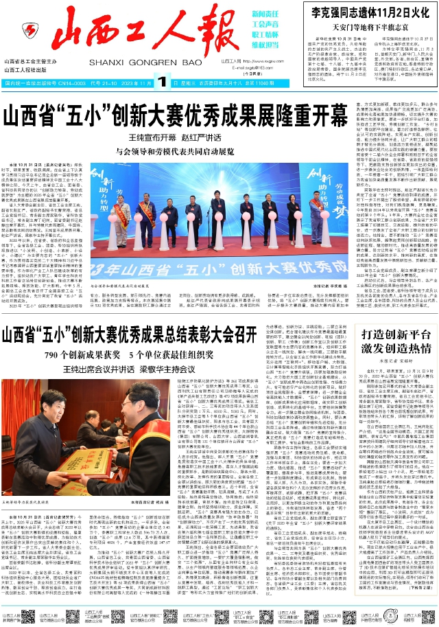 2022年以來,在省委、省政府和全總堅強領導下,全省各級工會、團委、科協組織將縱深推進以“小發明、小創造、小革新、小設計、小建議”為主要內容的“五小”創新大賽,作為貫徹落實黨的二十大精神和習近平總書記考察調研山西重要講話重要指示精神的重要舉措,作為深化產業工人隊伍建設改革的有力抓手,組織動員廣大職工、青年學生和農村科技工作者立足崗位創新創造,推動大賽不斷拓展領域、釋放效能、擴大影響。今年5月,全國總工會在我省召開了全國縣級工會“五小”活動現場會,充分肯定了我省“五小”活動的開展成效。