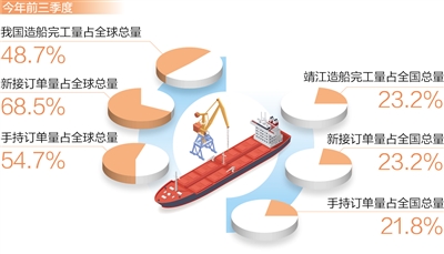 今年前三季度,我國造船完工量、新接訂單量和手持訂單量以載重噸計(jì)分別占全球總量的48.7%、68.5%和54.7%,均居世界第一。在江蘇泰州靖江市,當(dāng)?shù)卦齑髽I(yè)的訂單排到了2026年,成為我國船舶業(yè)轉(zhuǎn)型升級(jí)、穩(wěn)步向好的縮影。