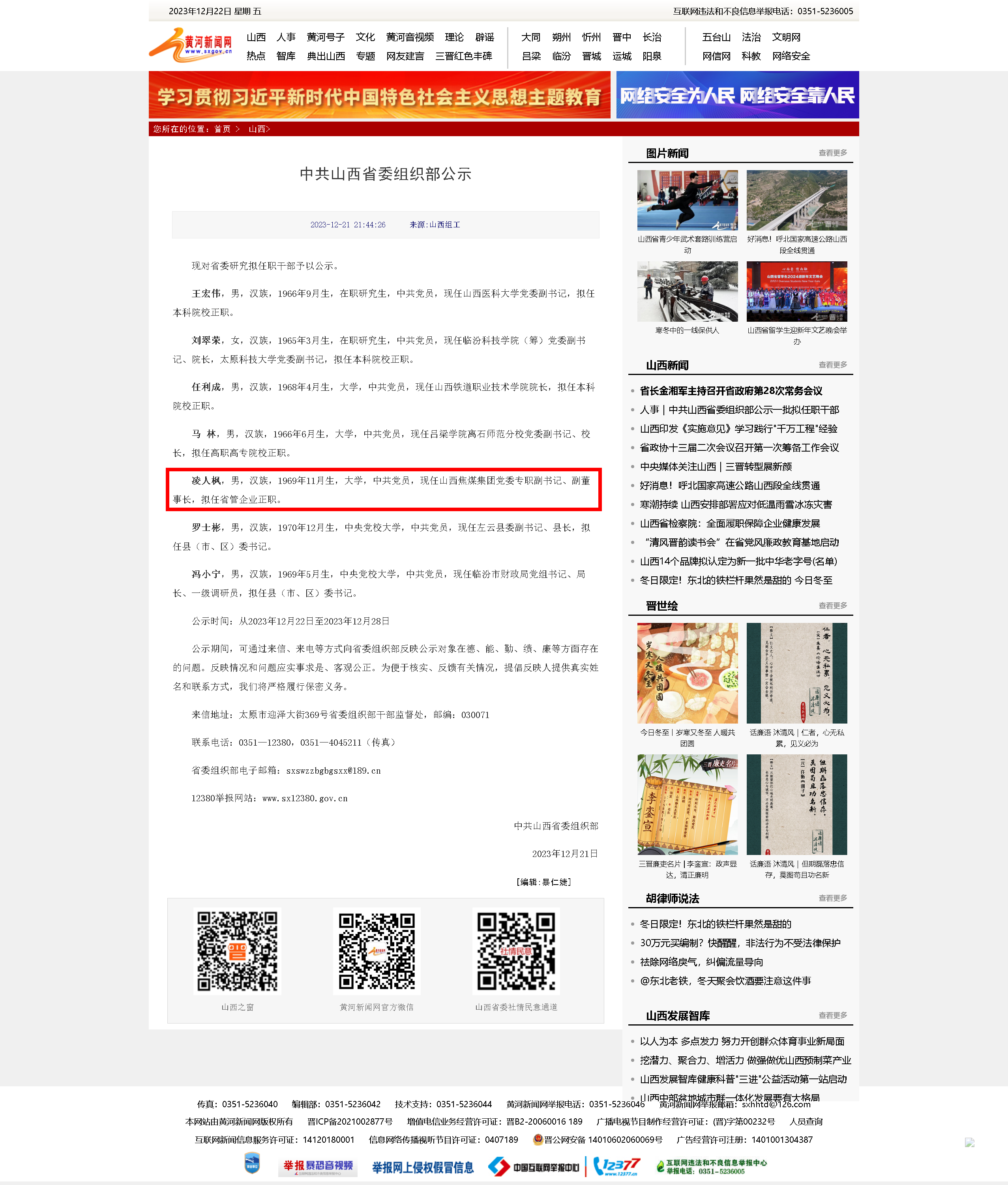 12月21日,山西省委組織部發布最新擬任職干部公示名單,現任山西焦煤集團黨委專職副書記、副董事長凌人楓擬任省管企業正職。