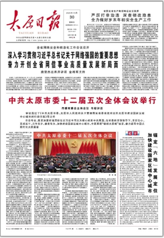 中國共產黨太原市第十二屆委員會第五次全體會議于2023年11月29日舉行。
