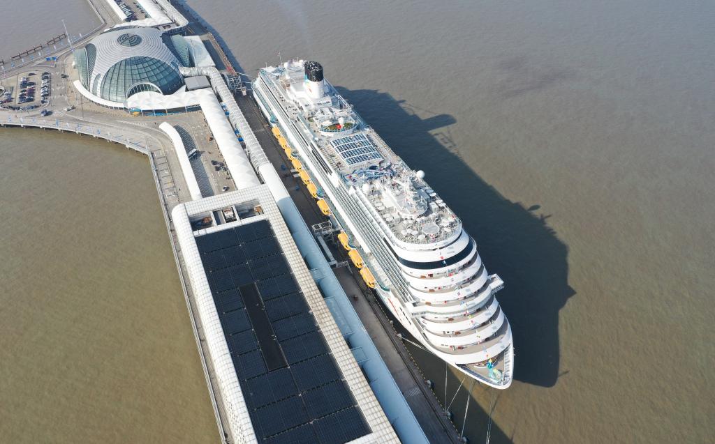1月1日,“愛達(dá)·魔都號(hào)”停靠在上海吳淞口國(guó)際郵輪港(無(wú)人機(jī)照片)。新華社記者 丁汀 攝