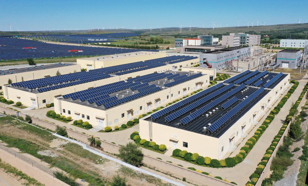 在河北張家口,國(guó)家風(fēng)光儲(chǔ)輸示范工程內(nèi)數(shù)排儲(chǔ)能廠房并列其中。(2023年8月18日攝,無人機(jī)照片)。新華社記者李賀 攝
