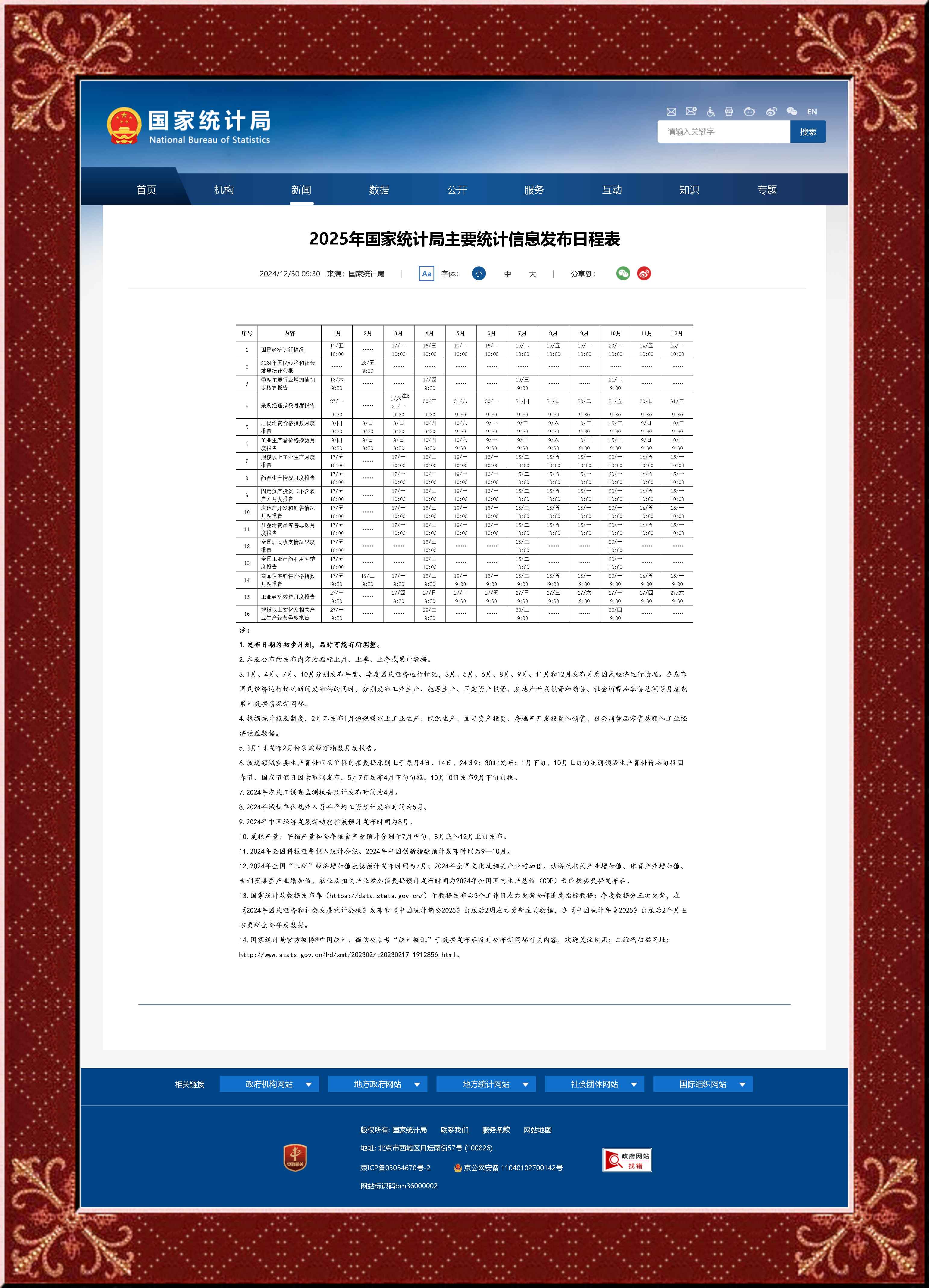 【行業資料】2025年國家統計局主要統計信息發布日程表