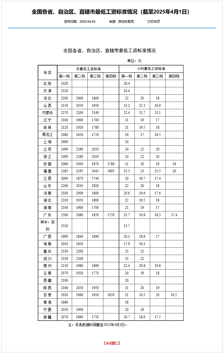 全國各省、自治區、直轄市最低工資標準情況(截至2025年4月1日)
