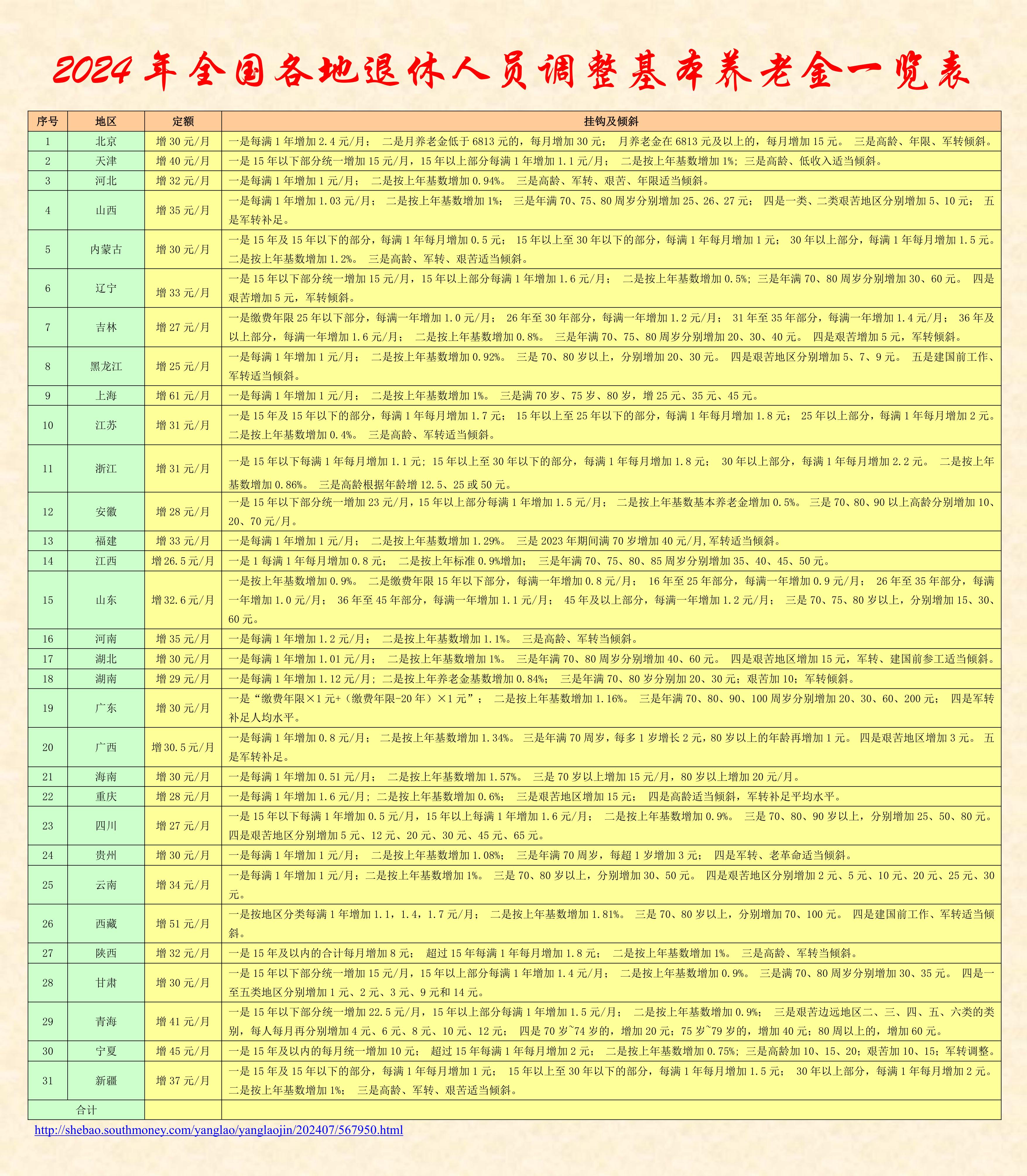 【行業資料】2024年全國各地退休人員調整基本養老金一覽表