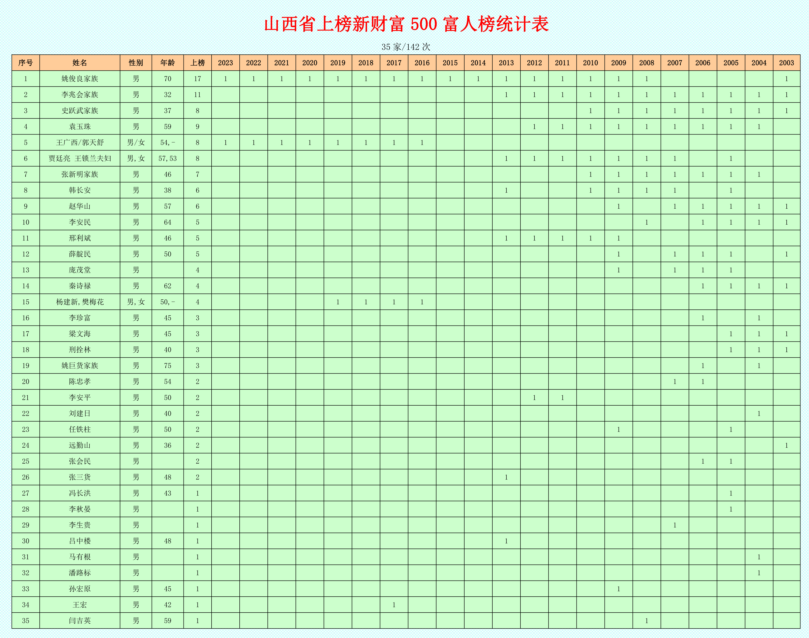 26 李兆會家族 男 22 2003 20.4 22 山西聞喜 海鑫集團 鋼鐵 22