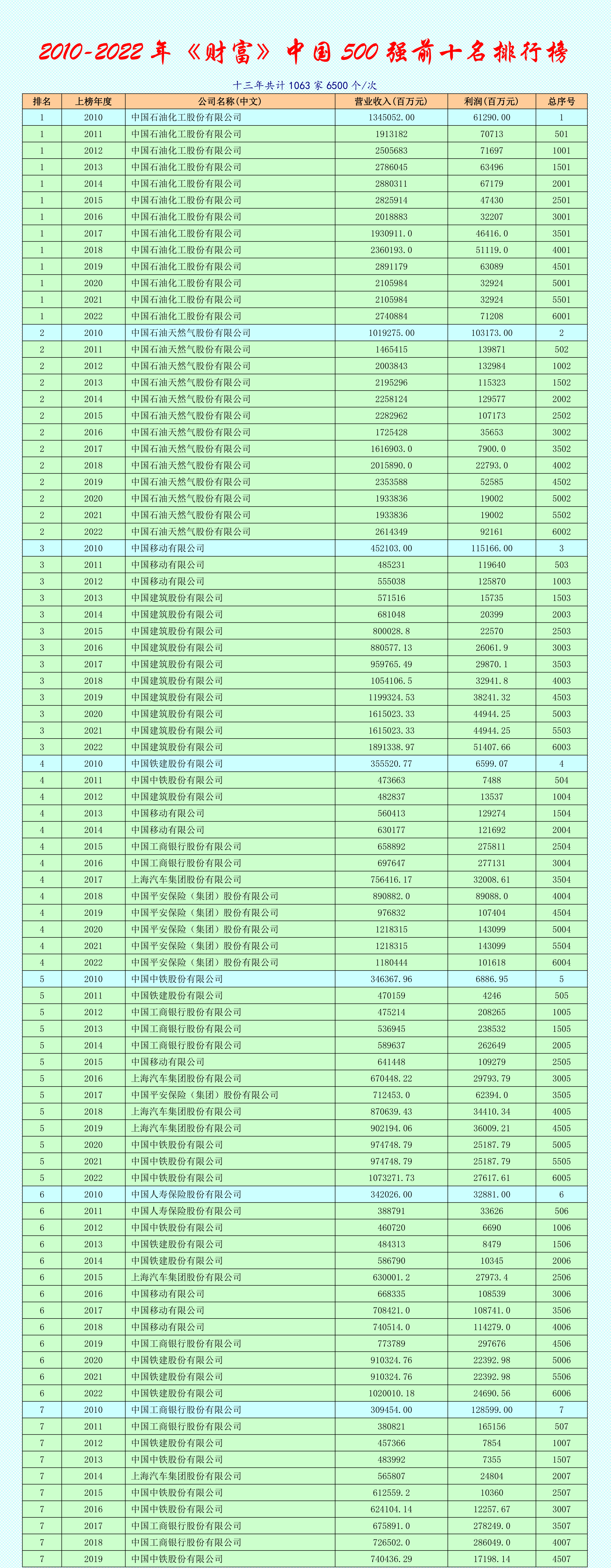 【行業(yè)資料】2010-2022《財富》中國500強(qiáng)總榜單