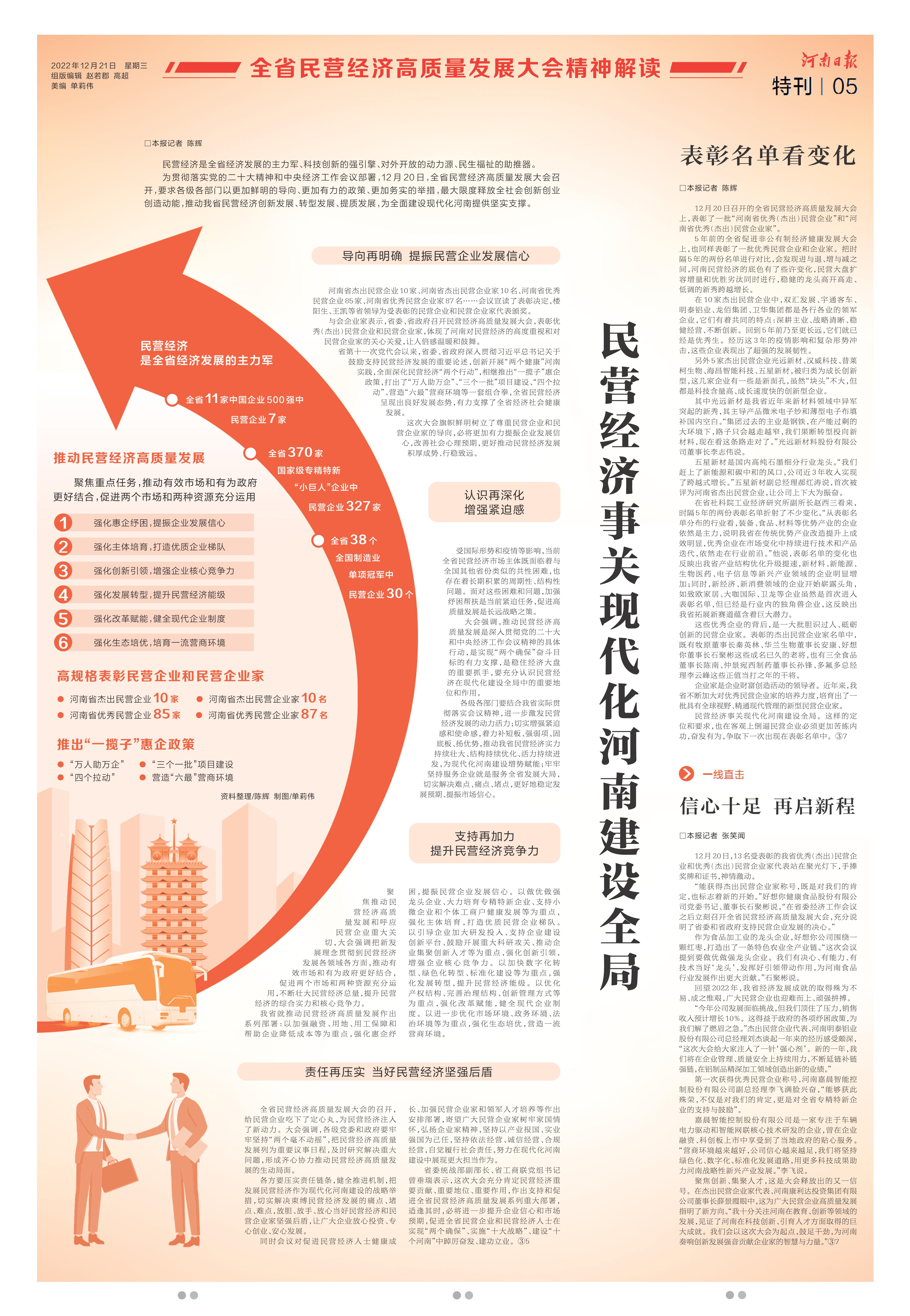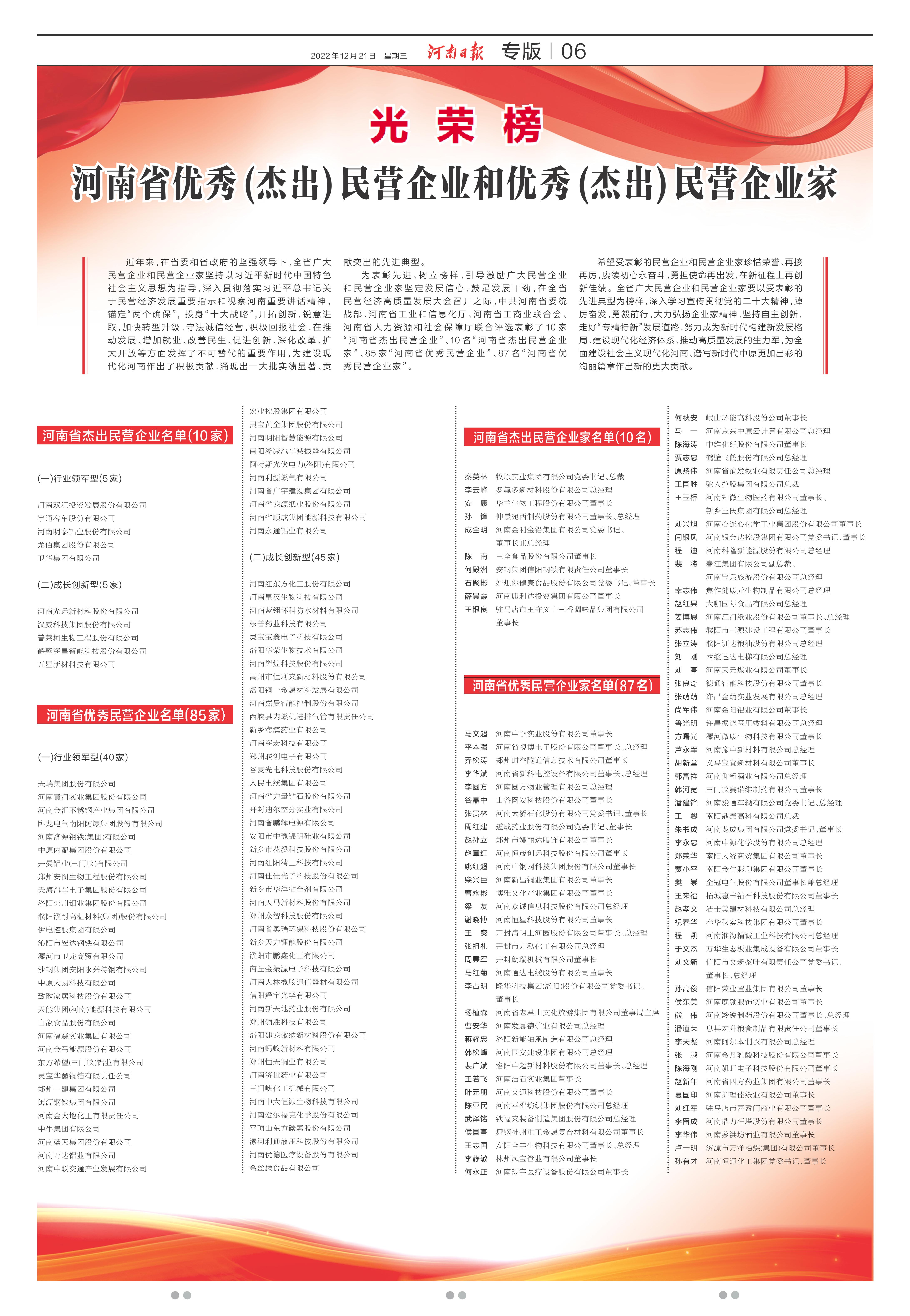 為表彰先進(jìn)、樹立榜樣,引導(dǎo)激勵(lì)廣大民營(yíng)企業(yè)和民營(yíng)企業(yè)家堅(jiān)定發(fā)展信心,鼓足發(fā)展干勁,在全省民營(yíng)經(jīng)濟(jì)高質(zhì)量發(fā)展大會(huì)召開之際,中共河南省委統(tǒng)戰(zhàn)部、河南省工業(yè)和信息化廳、河南省工商業(yè)聯(lián)合會(huì)、河南省人力資源和社會(huì)保障廳聯(lián)合評(píng)選表彰了10家“河南省杰出民營(yíng)企業(yè)”、10名“河南省杰出民營(yíng)企業(yè)家”、85家“河南省優(yōu)秀民營(yíng)企業(yè)”、87名“河南省優(yōu)秀民營(yíng)企業(yè)家”。