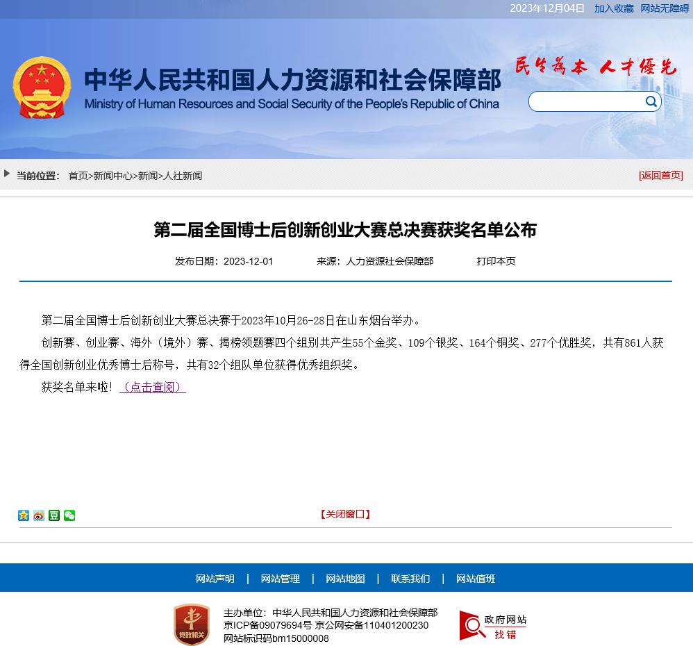 創新賽、創業賽、海外(境外)賽、揭榜領題賽四個組別共產生55個金獎、109個銀獎、164個銅獎、277個優勝獎,共有861人獲得全國創新創業優秀博士后稱號,共有32個組隊單位獲得優秀組織獎。