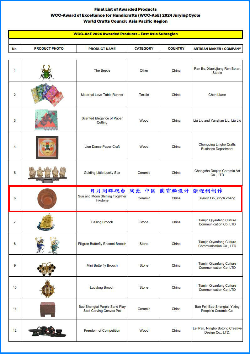 記者8月19日獲悉,由聯合國教科文組織與世界手工藝理事會開展的“2024世界手工藝理事會杰出手工藝品徽章認證”評審結果于日前揭曉,新絳縣絳州澄泥硯研制所藺霄麟設計、張迎利制作的絳州澄泥硯——“日月同輝硯”,獲頒“世界杰出手工藝品徽章”,這是本次評審山西唯一獲獎作品。