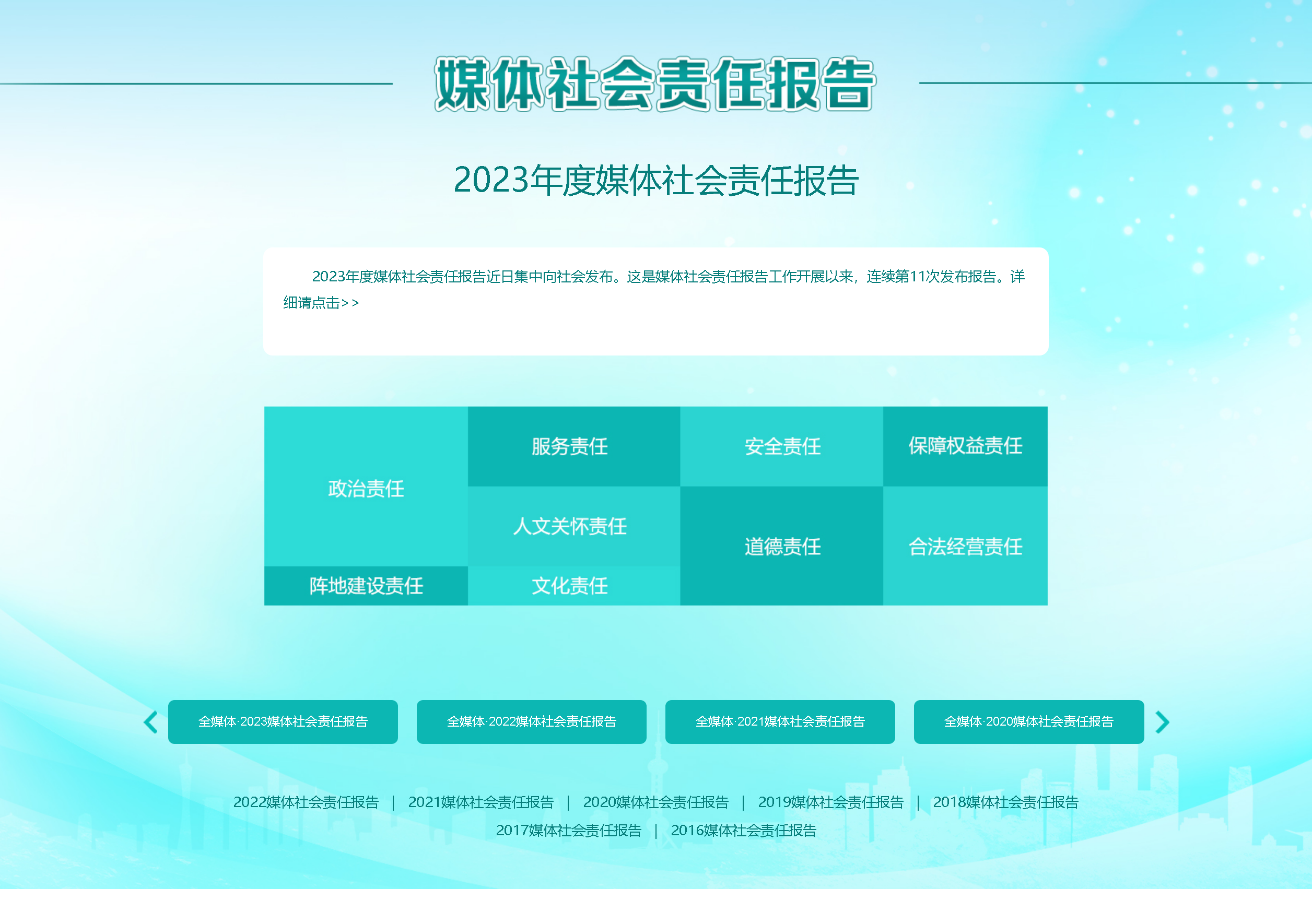 委員評(píng)議認(rèn)為,2023年度媒體社會(huì)責(zé)任報(bào)告實(shí)現(xiàn)三“度”提升:內(nèi)容更有厚度,文字簡(jiǎn)練暢達(dá)、案例典型生動(dòng),報(bào)告質(zhì)量進(jìn)一步提升;編排更有美度,圖表數(shù)據(jù)豐富,交互式、沉浸式體驗(yàn)增強(qiáng),展示了一批創(chuàng)意新穎、形象生動(dòng)的新媒體產(chǎn)品;效果更有溫度,形式手段創(chuàng)新豐富,融媒體呈現(xiàn)、多渠道展示成為主流,傳播效能進(jìn)一步增強(qiáng),社會(huì)影響力進(jìn)一步擴(kuò)大。