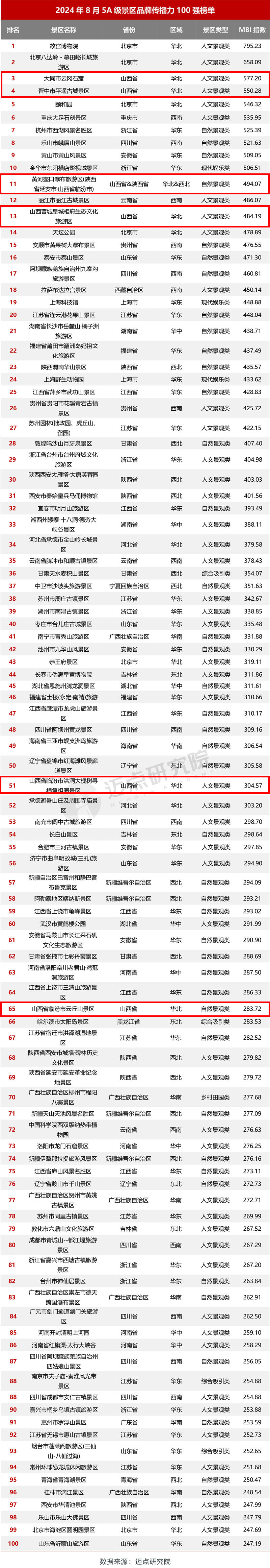 【綜合信息】2024年8月5A級景區品牌傳播力100強榜單
