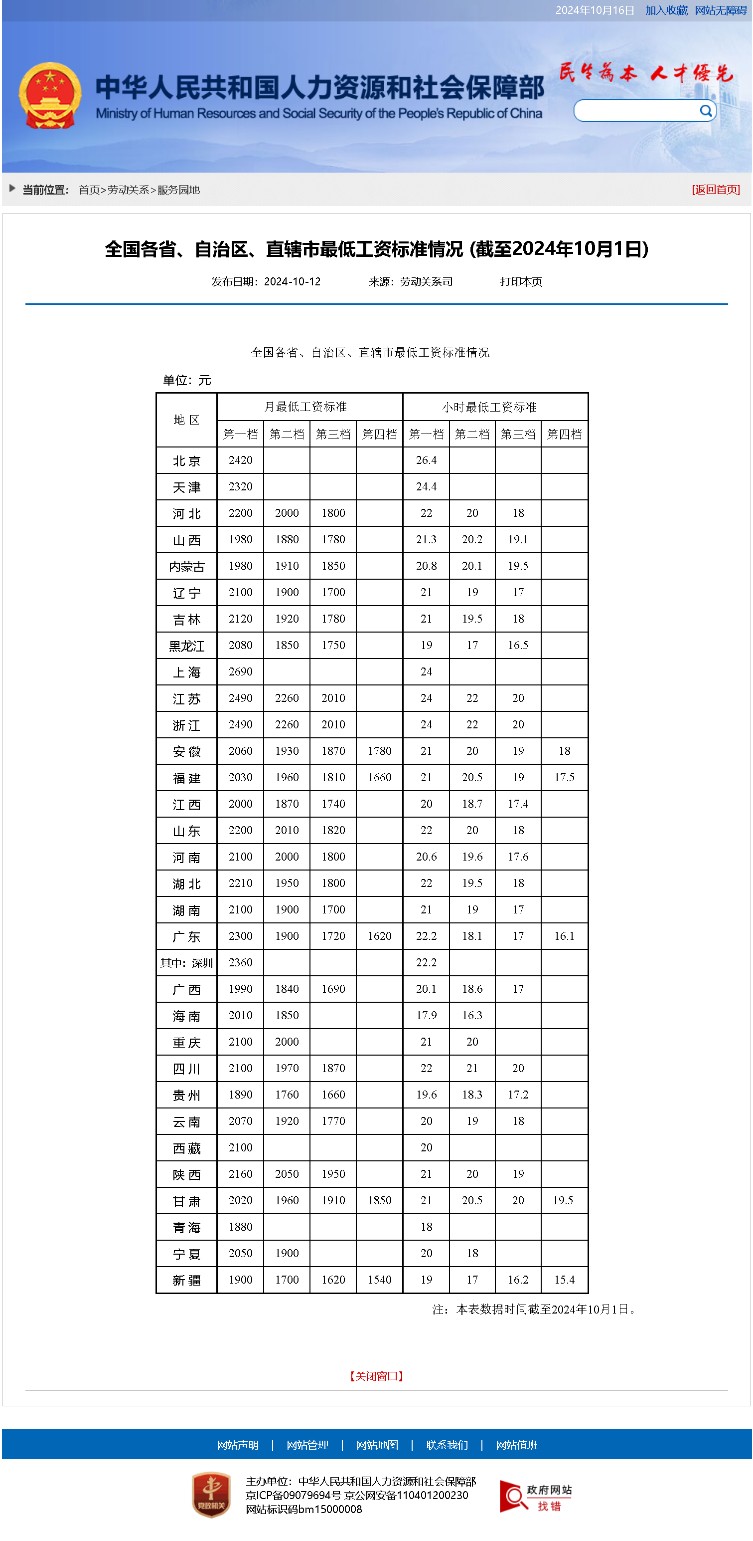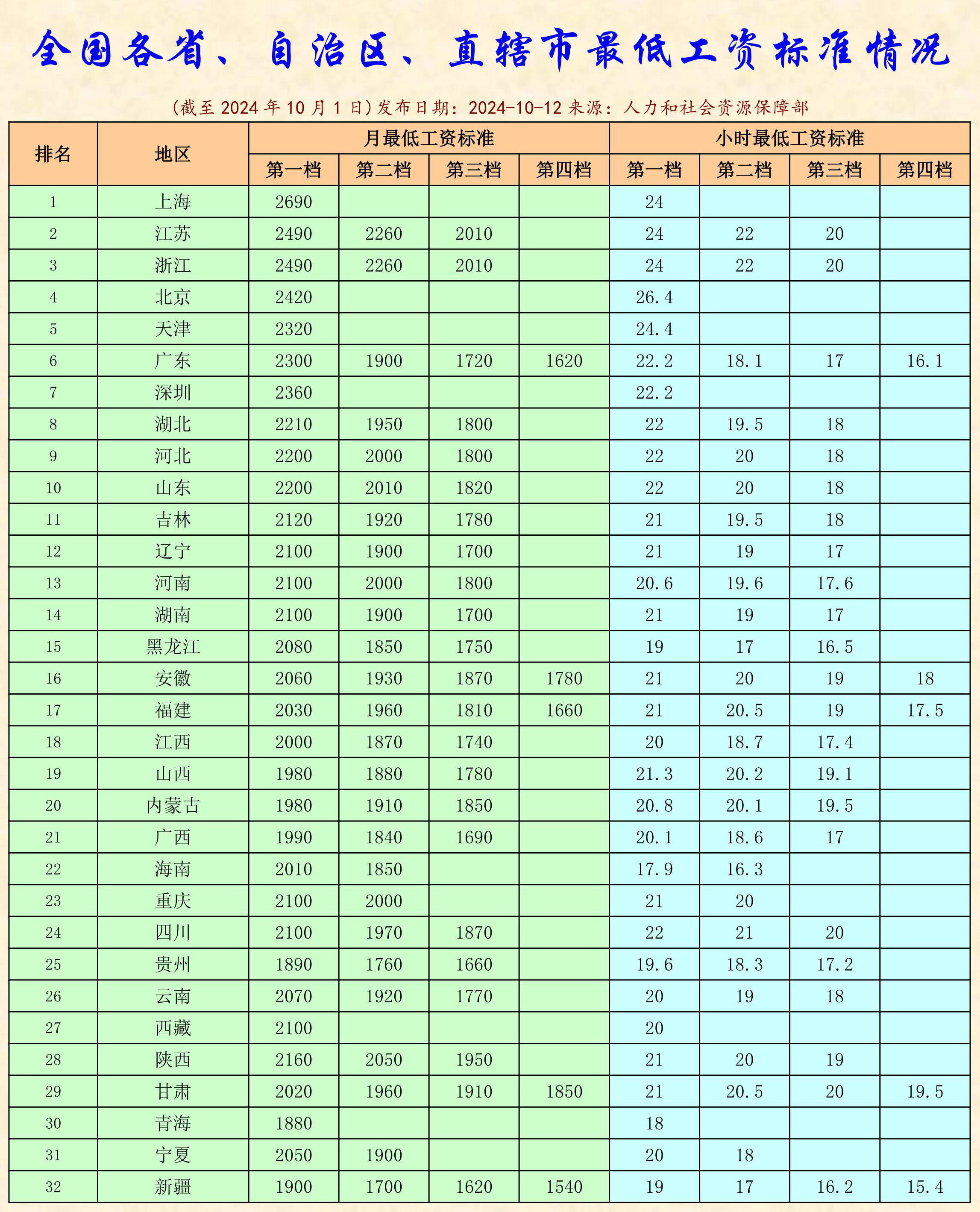 【綜合信息】全國各省、自治區、直轄市最低工資標準情況 (截至2024年10月1日)