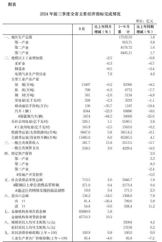 總的來看,前三季度全省經濟運行保持穩定恢復態勢。尤其是進入三季度以來,隨著一系列宏觀政策成效逐步顯現,部分行業領域呈現積極變化,9月當月,全省固定資產投資增速較8月份由負轉正回升4.9個百分點,一般公共預算收入由負轉正回升16.0個百分點,限額以上消費品零售額由負轉正回升1.9個百分點,其中家用電器和音像器材類零售額加快18.2個百分點。但外部環境復雜嚴峻,經濟穩增長基礎尚不牢固。下一步,全省上下要全面貫徹落實黨的二十屆三中全會精神,按照黨中央關于經濟工作的決策部署,圍繞省委、省政府工作重點,堅定發展信心、積極主動作為,補足短板弱項、增強內生動力,強化存量政策和增量政策協同發力,鞏固經濟穩定運行、回升向好基礎,努力完成全年經濟社會發展目標任務。