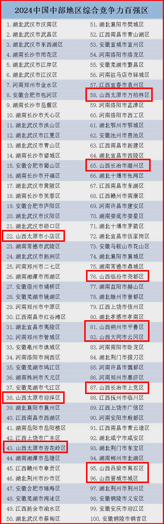 山西上榜的11個區中,太原市小店區、迎澤區、杏花嶺區、萬柏林區分別位列第22位、38位、43位、58位。其余為長治市潞州區、臨汾市堯都區、朔州市平魯區、大同市云岡區、長治市上黨區、呂梁市離石區、晉城市城區,分別位列第65位、76位、81位、82位、87位、95位、96位。