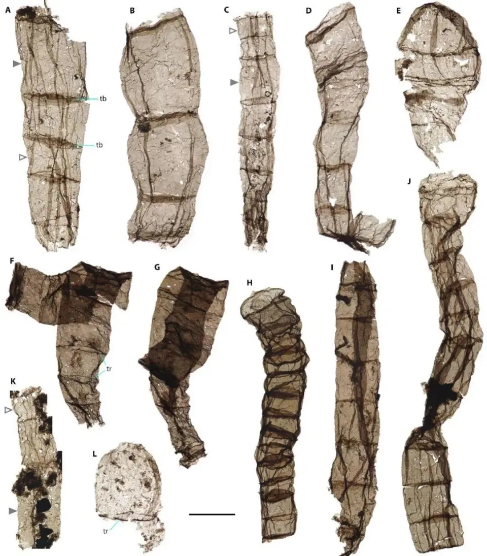 ▲串嶺溝組中發(fā)現(xiàn)的壯麗青山藻。化石保存為有機(jī)質(zhì)壁構(gòu)成的多細(xì)胞絲狀體,顯示細(xì)胞大小和形態(tài)的變化引起的絲狀體形態(tài)變化。絲狀體直徑向一端收縮(A-D、F-I、K),絲狀體直徑不變(J),保存有完整端部的絲狀體(E、L)。比例尺對于F-H和K代表100微米,其余的代表50微米。
