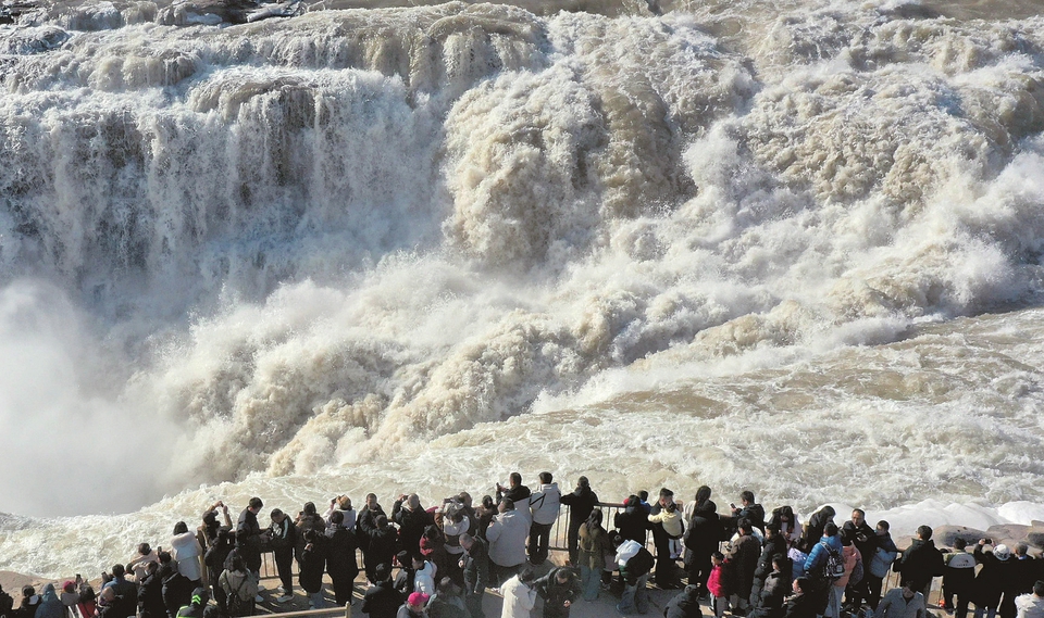 1月29日,游客在吉縣黃河壺口瀑布景區游覽觀瀑。新春佳節,吉縣黃河壺口瀑布以其奔騰咆哮的雄姿和冰瀑彩虹的壯美景色,吸引了眾多游客