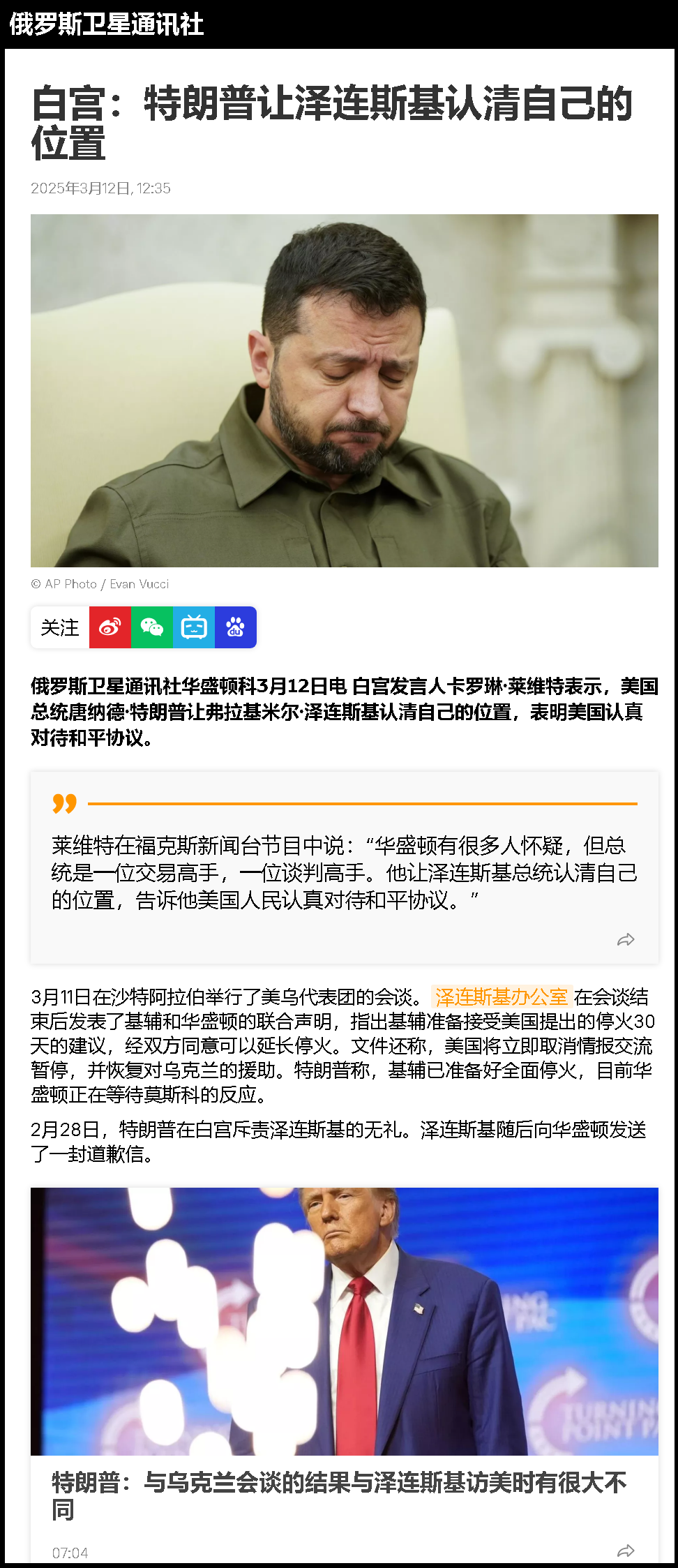 烏克蘭總統(tǒng)澤連斯基當(dāng)晚在社交媒體上發(fā)文說,烏美吉達(dá)會談效果“良好且富有建設(shè)性”。烏方愿意接受美方30天停火的提議,但需要美方說服俄方采取相同措施,“如果俄方同意,停火將立即生效”。