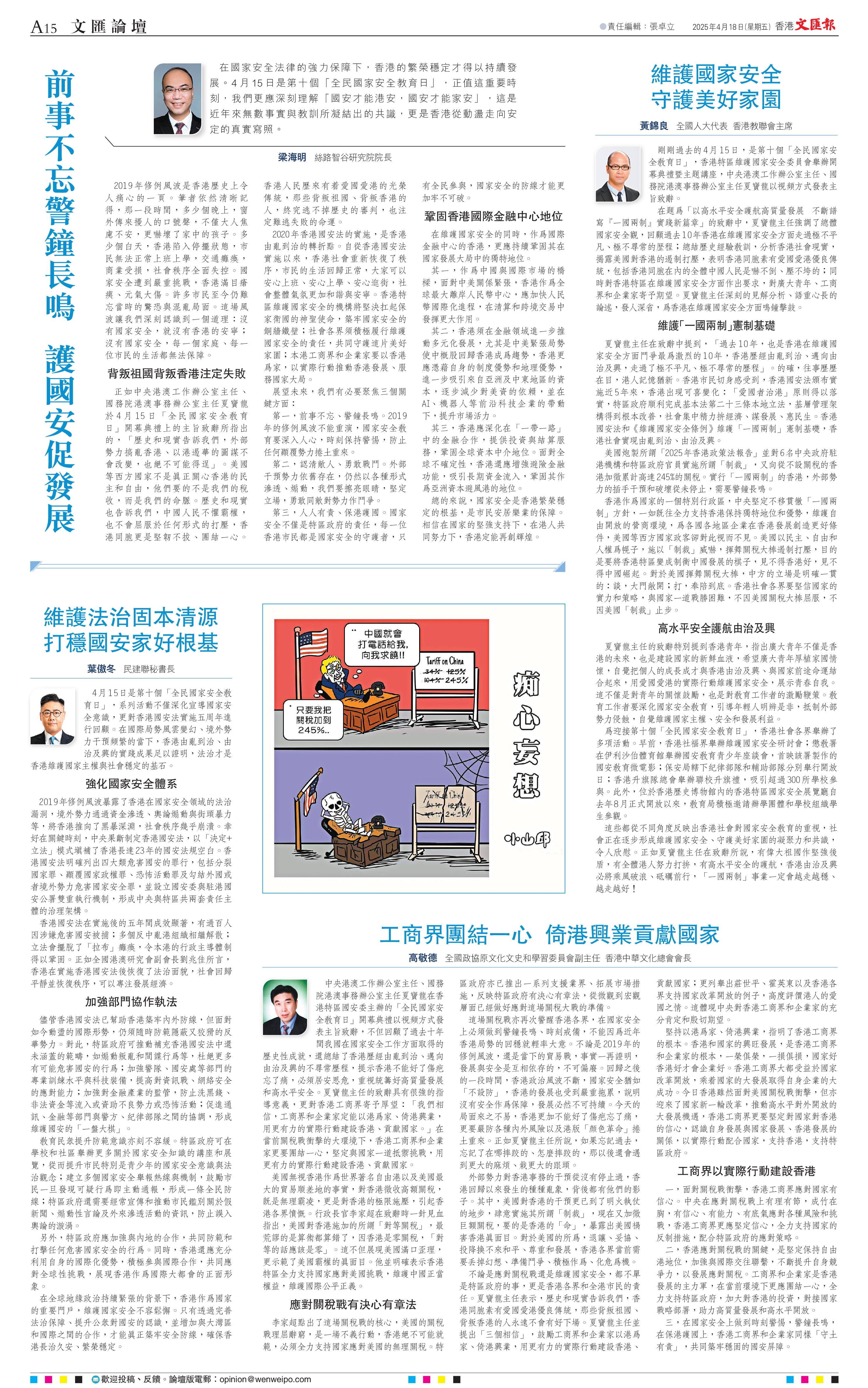 中央港澳工作辦公室主任、國務院港澳事務辦公室主任夏寶龍在香港特區國安委主辦的「全民國家安全教育日」開幕典禮以視頻方式發表主旨致辭,不但回顧了過去十年間我國在國家安全工作方面取得的歷史性成就,還總結了香港歷經由亂到治、邁向由治及興的不尋常歷程,提示香港不能好了傷疤忘了痛,必須居安思危,重視統籌好高質量發展和高水平安全。夏寶龍主任的致辭具有很強的指導意義,更對香港工商界寄予厚望:「我們相信,工商界和企業家定能以港為家、倚港興業,用更有力的實際行動建設香港、貢獻國家。」在當前關稅戰沖擊的大環境下,香港工商界和企業家更要團結一心,堅定與國家一道抵御挑戰,用更有力的實際行動建設香港、貢獻國家。