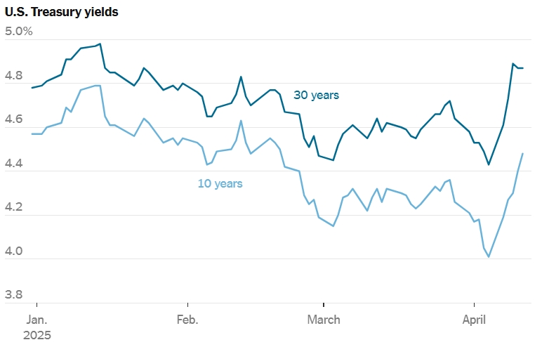在上述報(bào)告發(fā)布之際,美國(guó)股市持續(xù)動(dòng)蕩。受美國(guó)總統(tǒng)特朗普所謂“對(duì)等關(guān)稅”政策沖擊,過去兩周,美國(guó)國(guó)債出現(xiàn)恐慌性拋售,30年期國(guó)債收益率一度上漲0.5個(gè)百分點(diǎn)。中美貿(mào)易緊張持續(xù),加劇了人們對(duì)中美“脫鉤”及全球經(jīng)濟(jì)日益惡化的擔(dān)憂。
