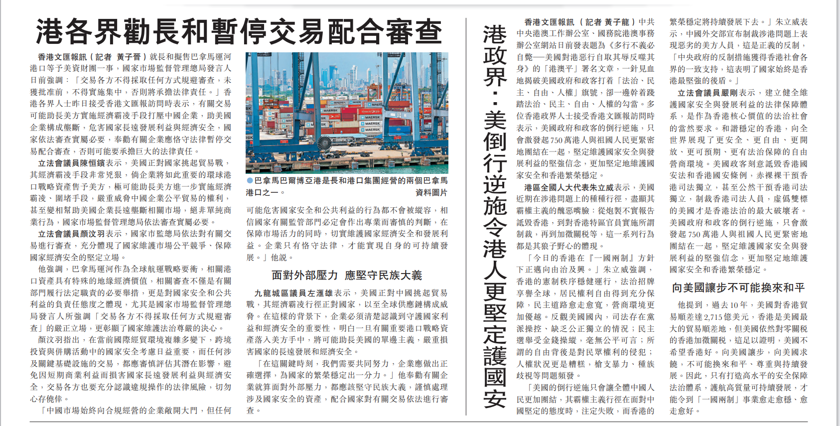 九龍城區議員左匯雄表示,美國正對中國挑起貿易戰,其經濟霸凌行徑正對國家,以至全球供應鏈構成威脅。在這樣的背景下,企業必須清楚認識到守護國家利益和經濟安全的重要性,明白一旦有關重要港口戰略資產落入美方手中,將可能助長美國的單邊主義,嚴重損害國家的長遠發展和經濟安全。