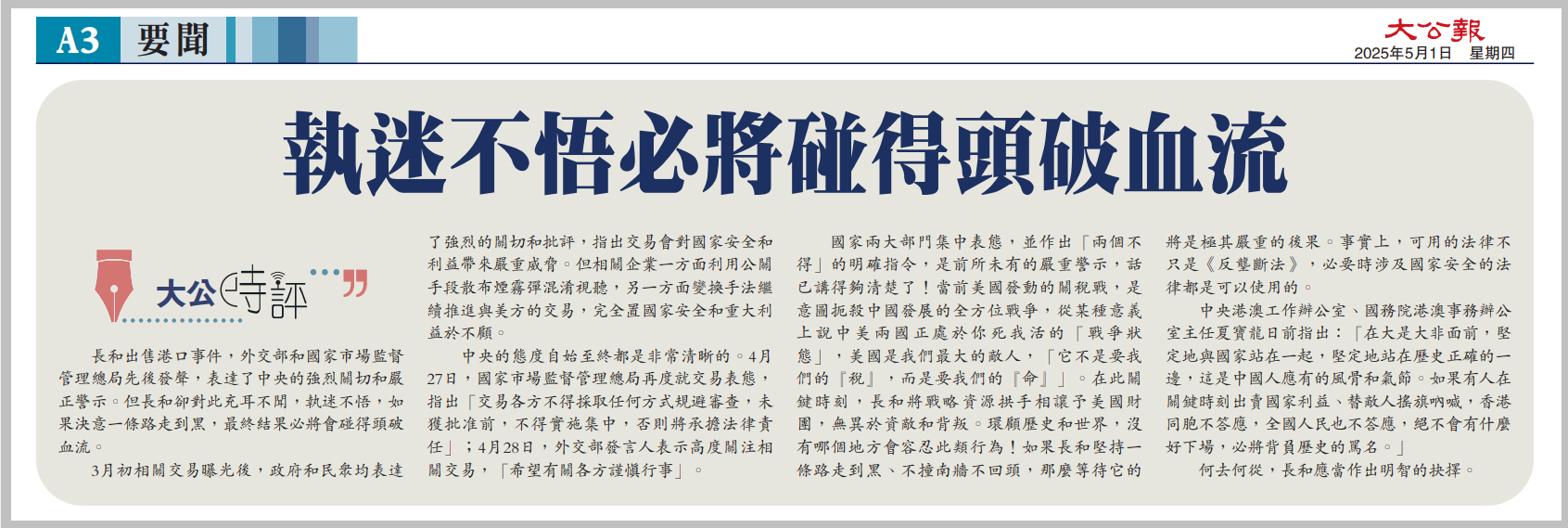國家兩大部門集中表態,并作出「兩個不得」的明確指令,是前所未有的嚴重警示,話已講得夠清楚了!當前美國發動的關稅戰,是意圖扼殺中國發展的全方位戰爭,從某種意義上說中美兩國正處于你死我活的「戰爭狀態」,美國是我們最大的敵人,「它不是要我們的『稅』,而是要我們的『命』」。在此關鍵時刻,長和將戰略資源拱手相讓予美國財團,無異于資敵和背叛。環顧歷史和世界,沒有哪個地方會容忍此類行為!如果長和堅持一條路走到黑、不撞南墻不回頭,那么等待它的將是極其嚴重的后果。事實上,可用的法律不只是《反壟斷法》,必要時涉及國家安全的法律都是可以使用的。